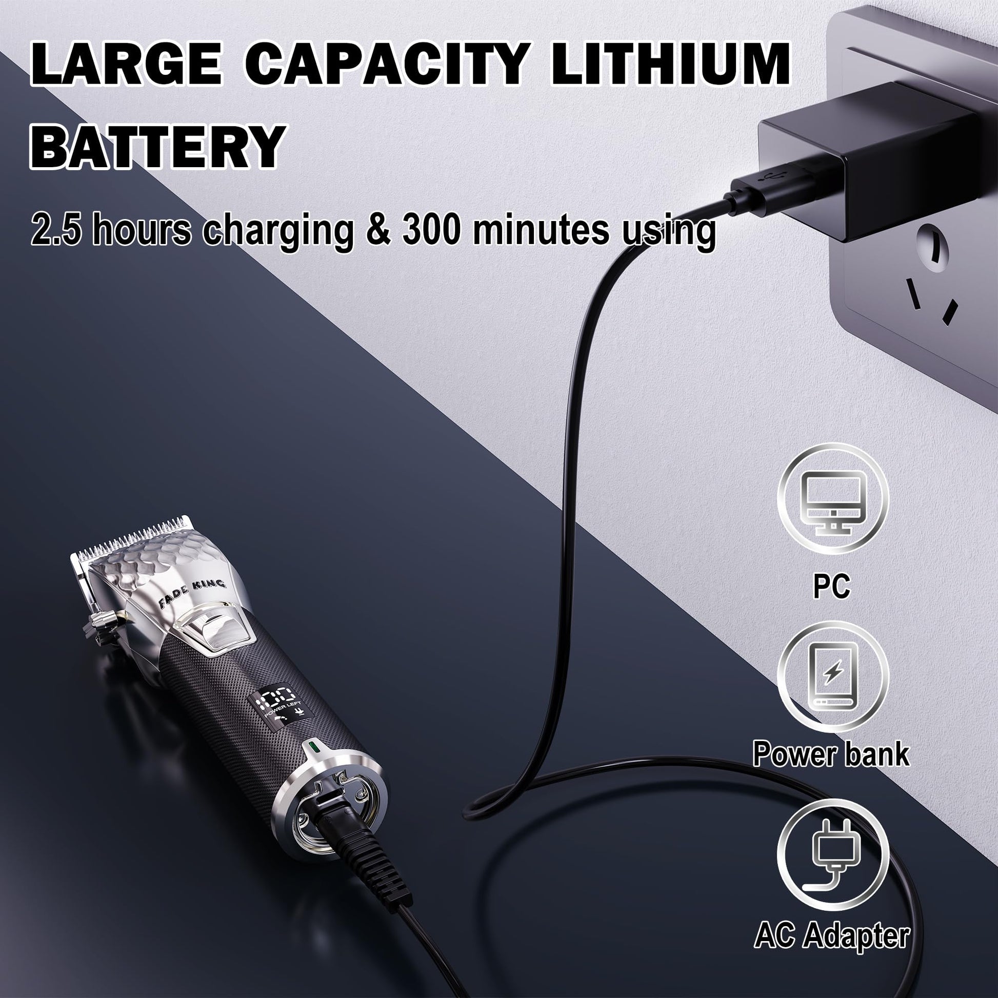 ✂【Wireless, Dual port Charging,5V DC and Type-C】- Our wireless hair clippers for men can be with cord or cordless which is super convenient for self-cutting. Universal charging - One full charge gives you up to 5 hours and half of use. Please note an Adapter might be needed (Not Included in Package).